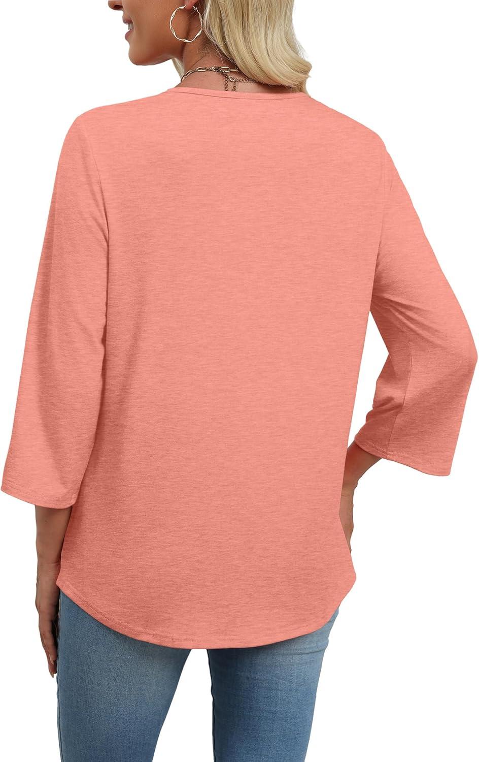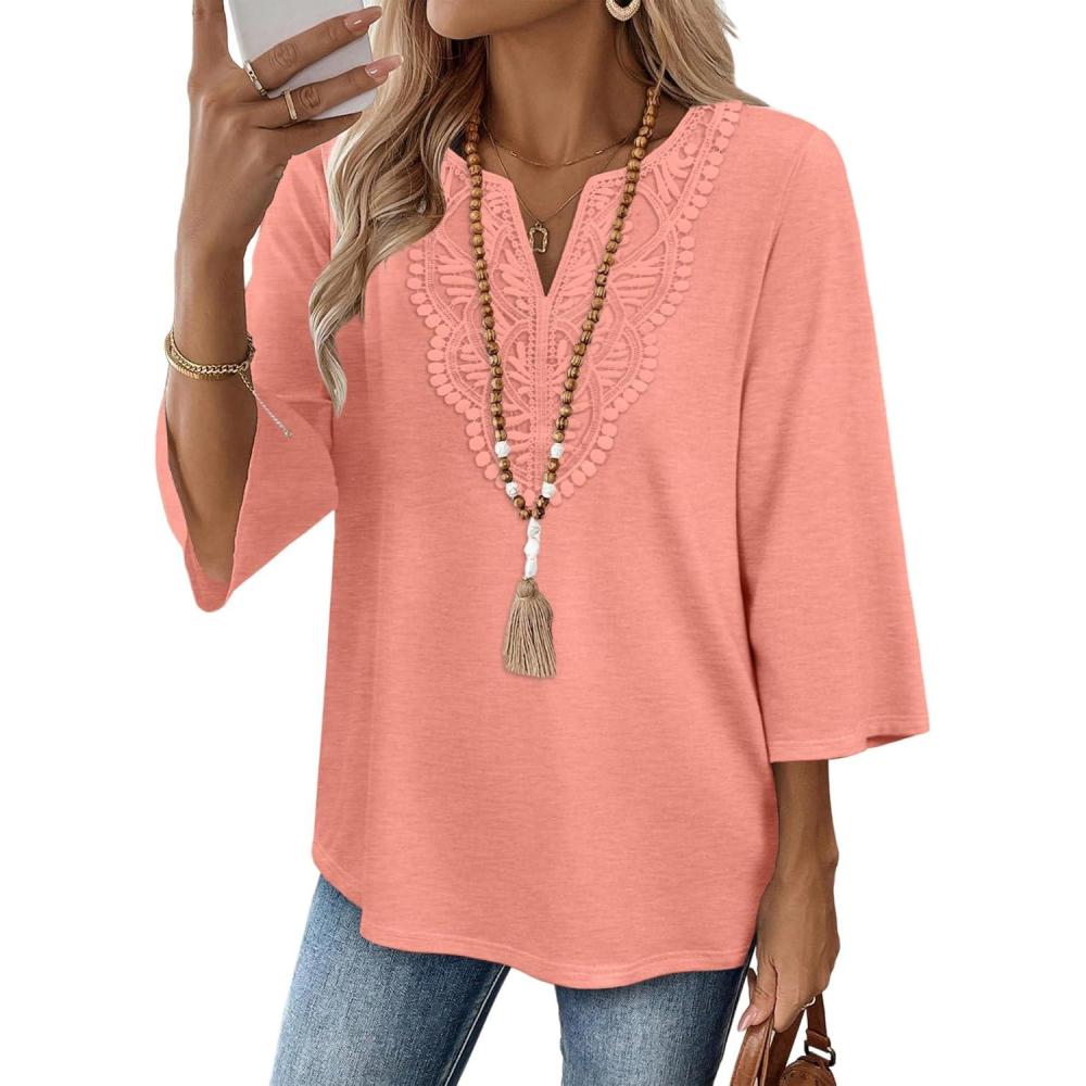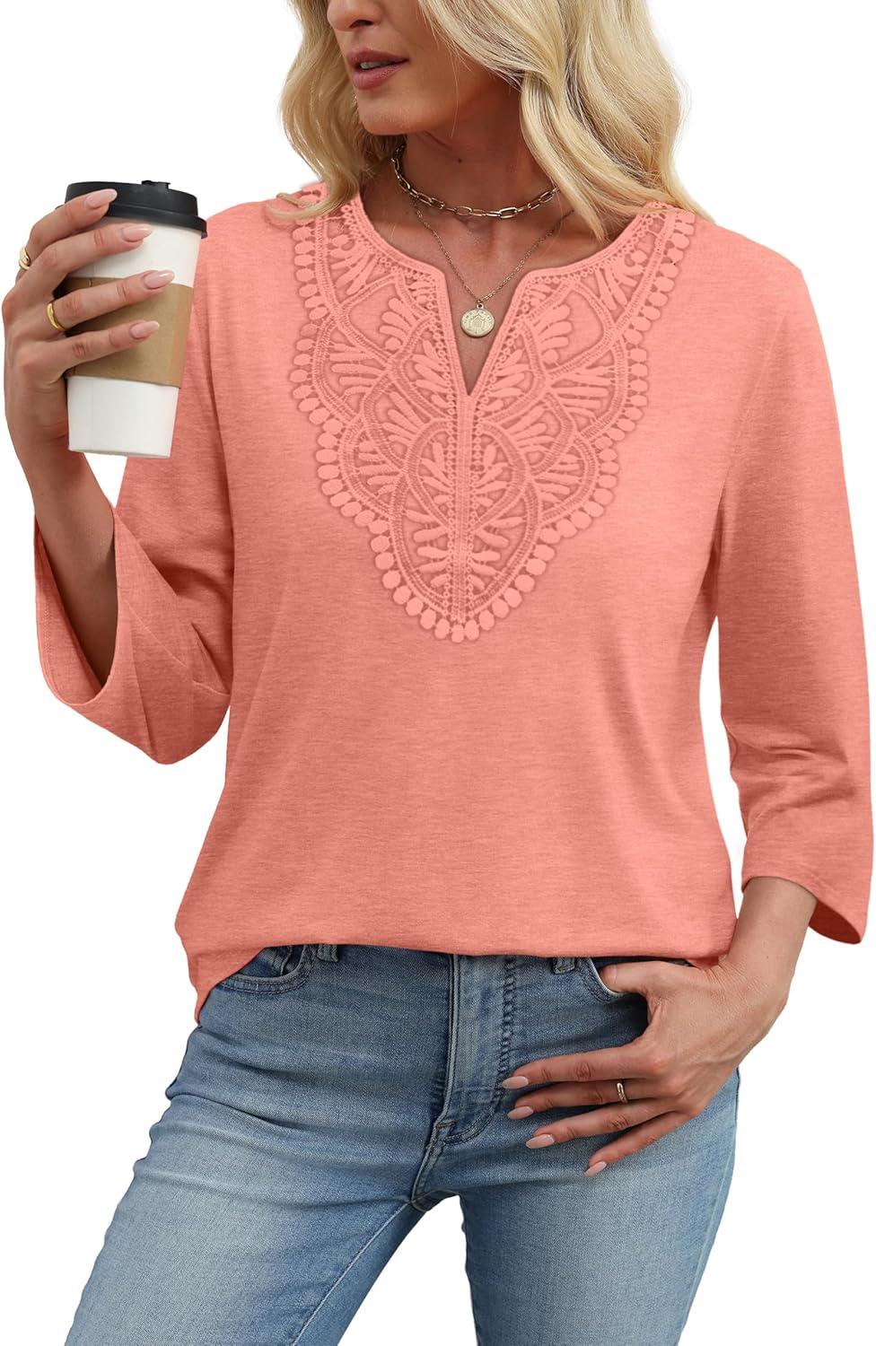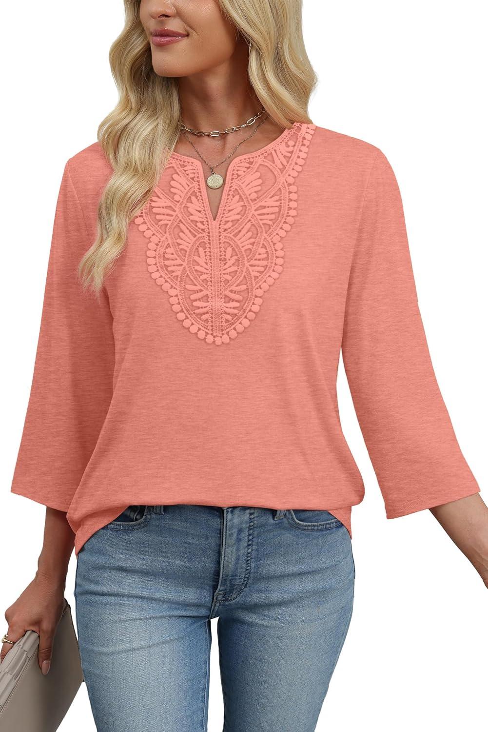 WIHOLL 3/4 Length Sleeve Womens Tops Boho V Neck Lace Shirts Trendy Blouses Dressy Casual Vacation Clothes(06 - Coral)