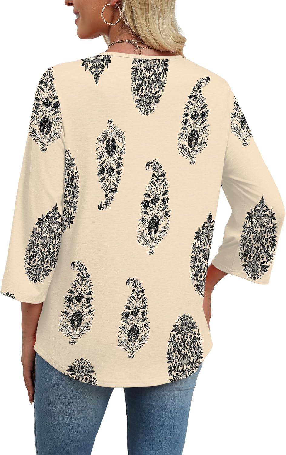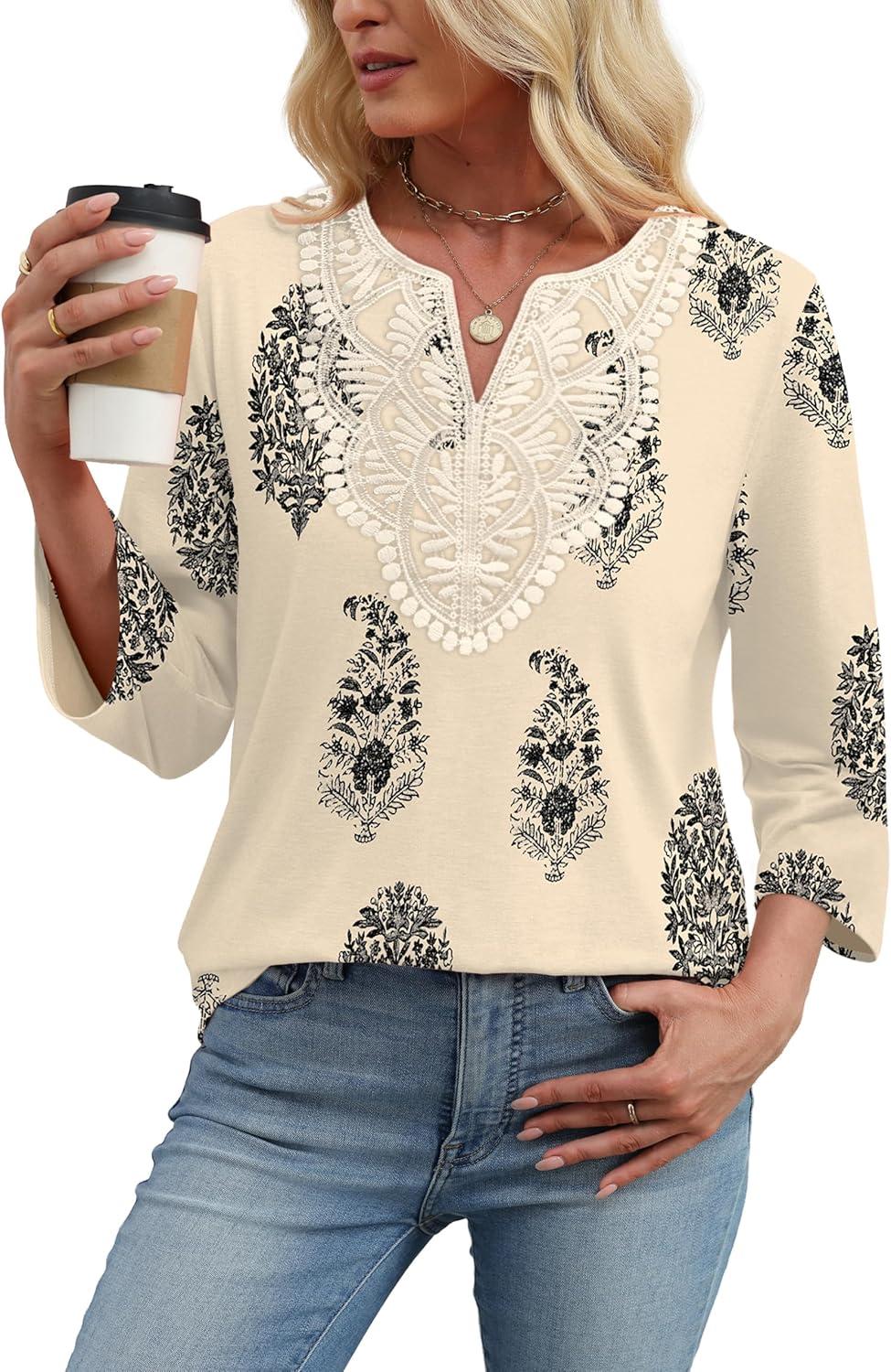 WIHOLL 3/4 Length Sleeve Womens Tops Boho V Neck Lace Shirts Trendy Blouses Dressy Casual Vacation Clothes(07 - Multi Apricot)