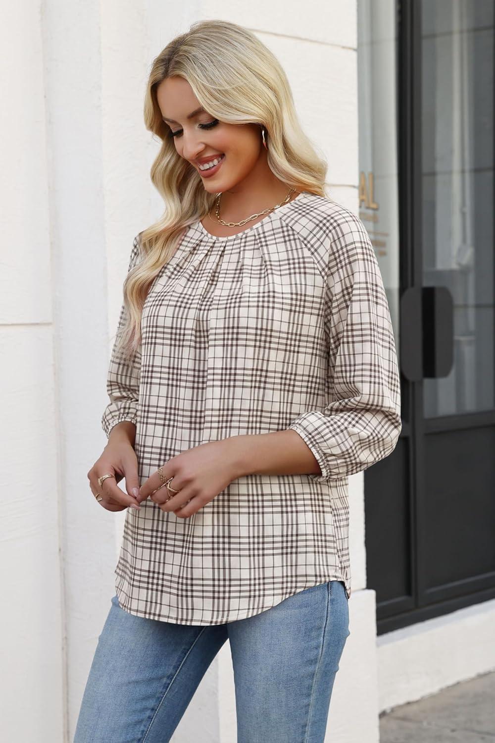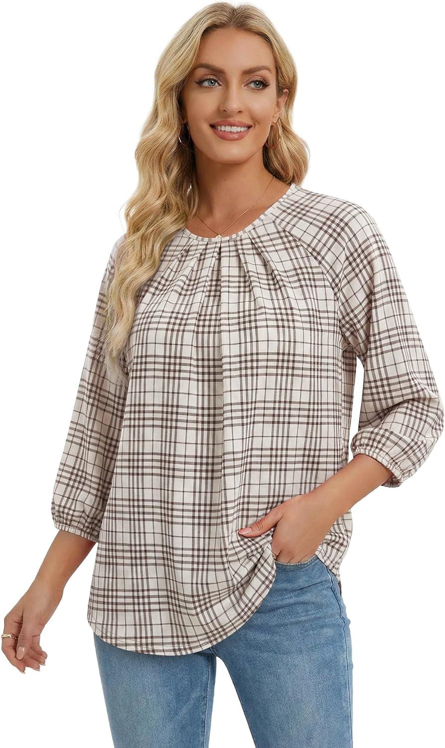 WIHOLL 3/4 Length Sleeve Womens Tops Pleated Front Crew Neck Blouses Dressy Casual Business Casual Spring Summer Shirts S-3XL(11 – Beige Plaid)
