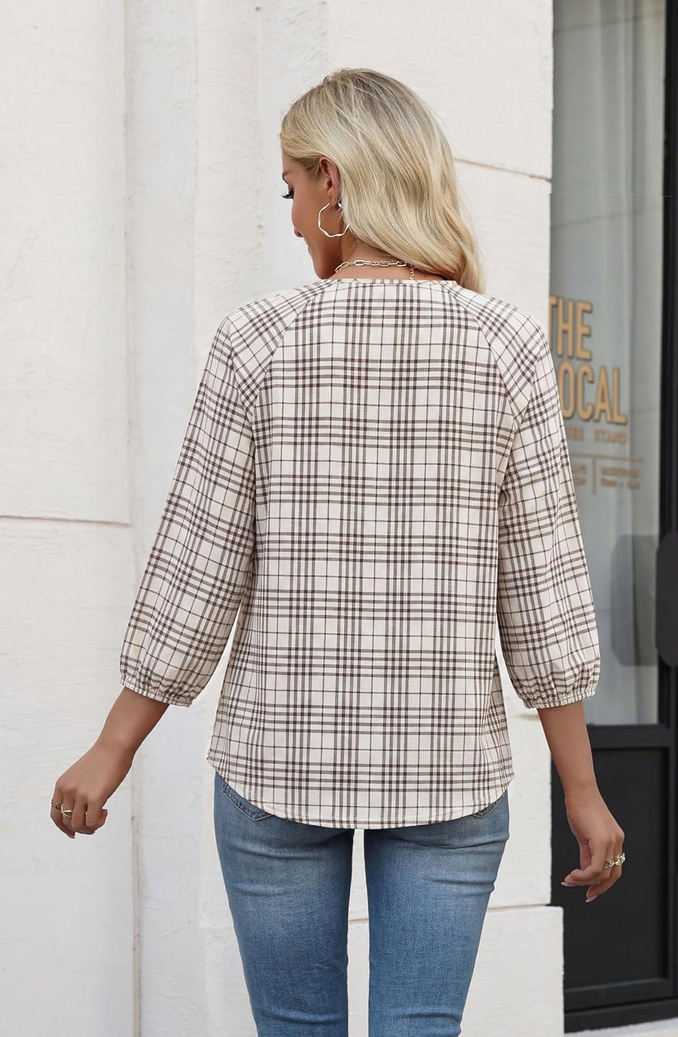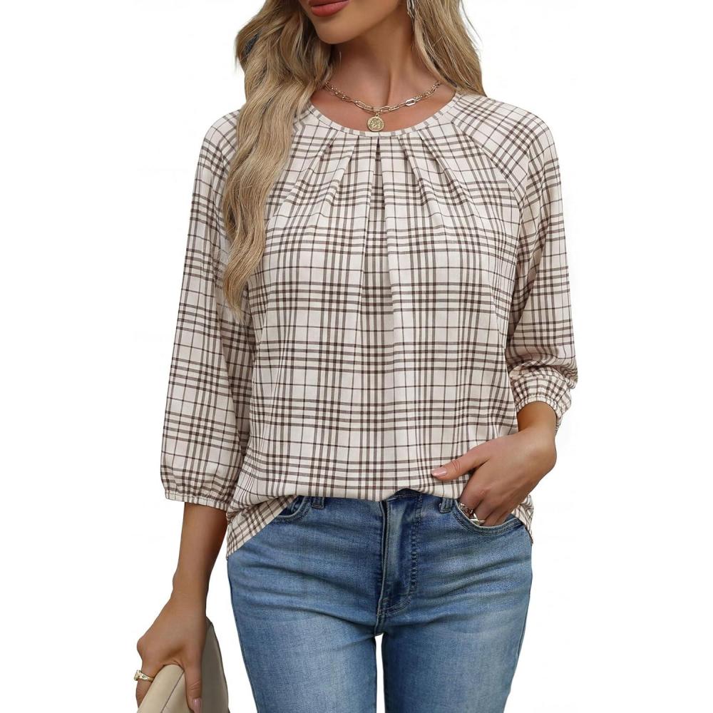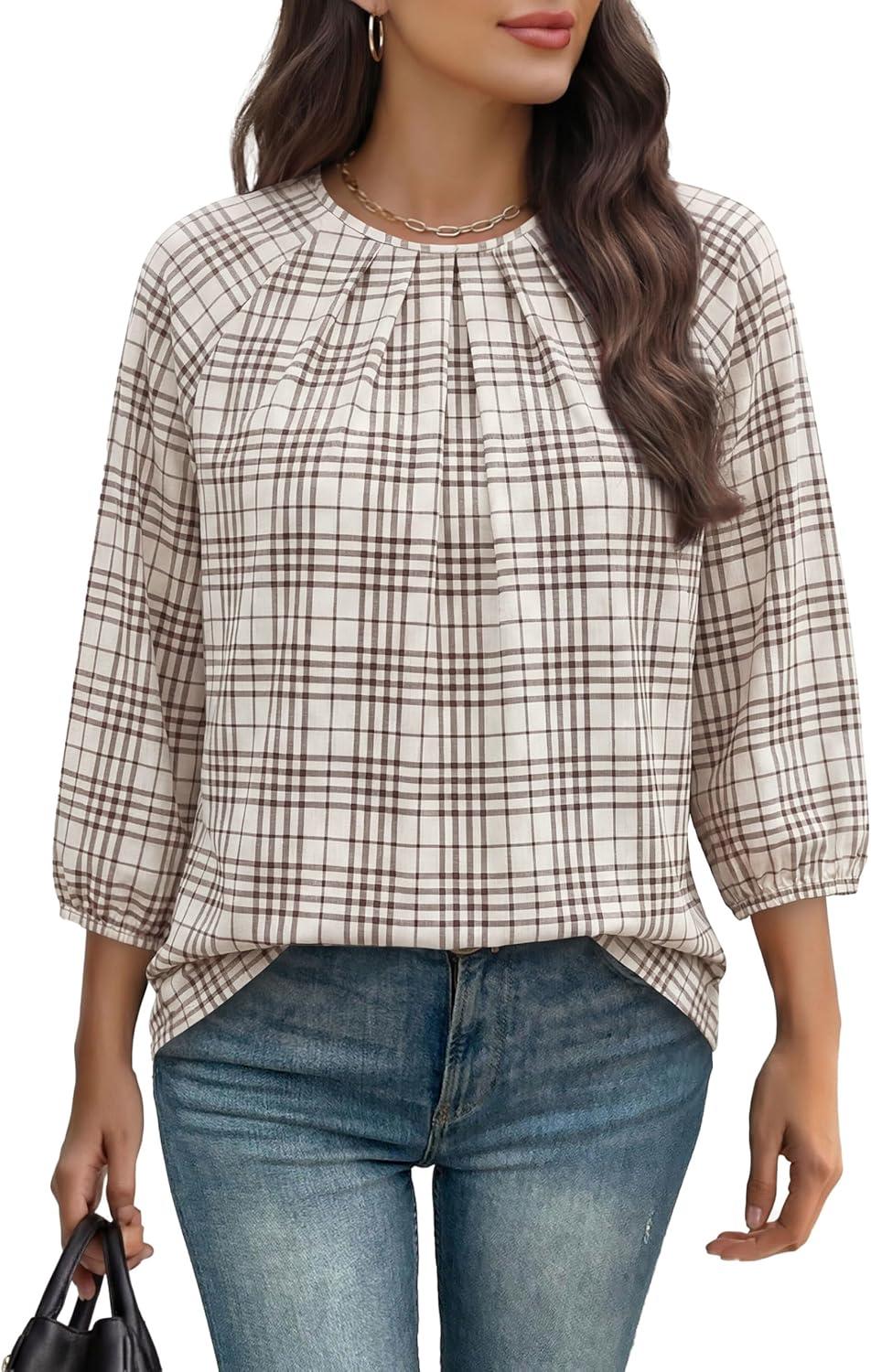 WIHOLL 3/4 Length Sleeve Womens Tops Pleated Front Crew Neck Blouses Dressy Casual Business Casual Spring Summer Shirts S-3XL(11 - Beige Plaid)