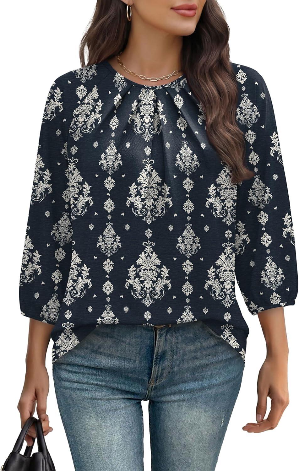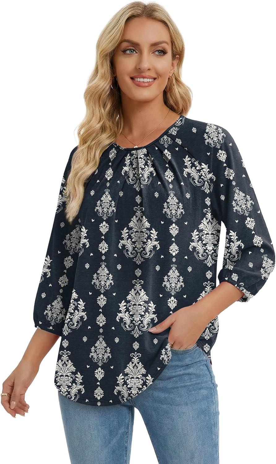 WIHOLL 3/4 Length Sleeve Womens Tops Pleated Front Crew Neck Blouses Dressy Casual Business Casual Spring Summer Shirts S-3XL(14 – Navy Vintage Floral)