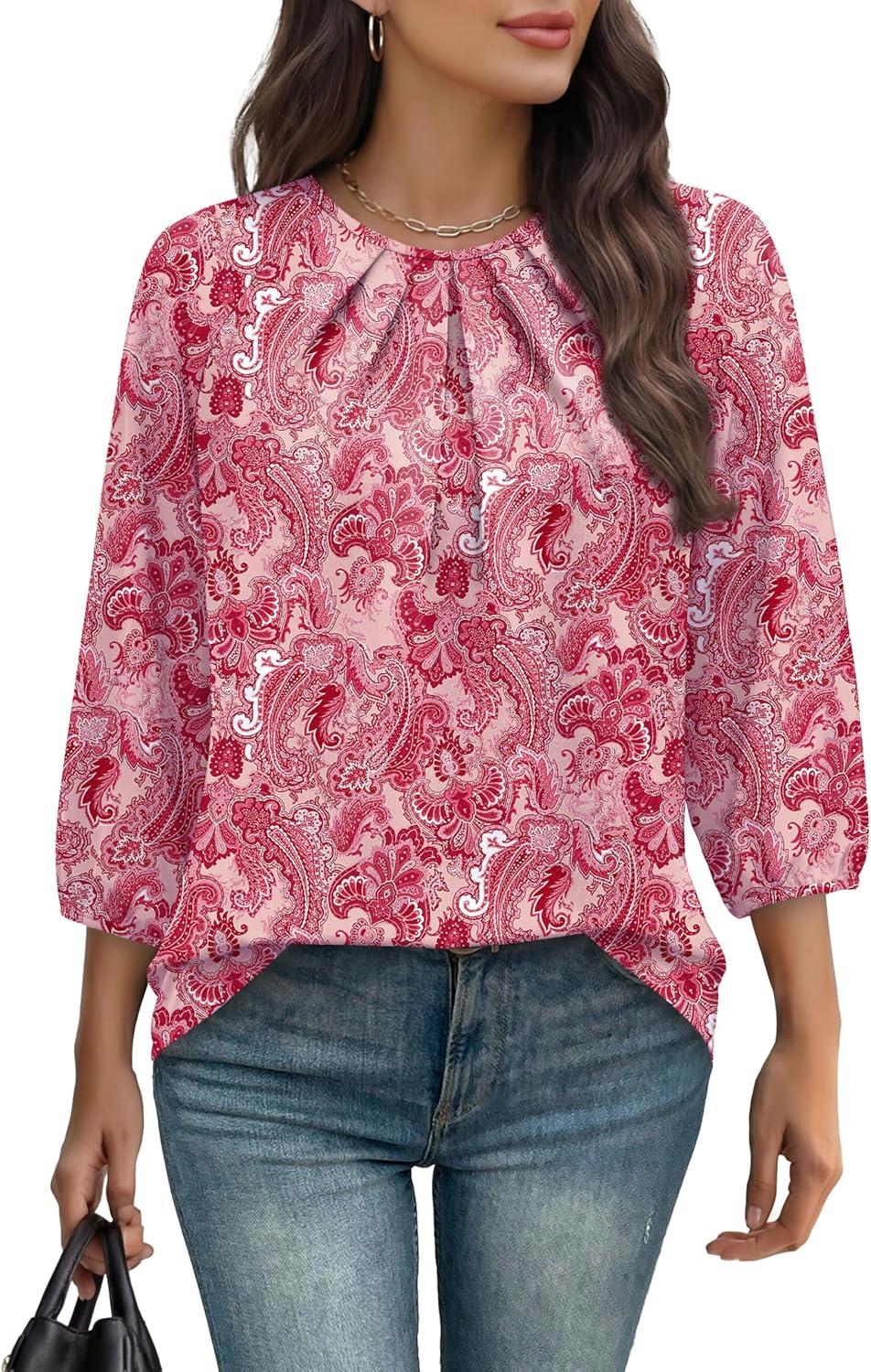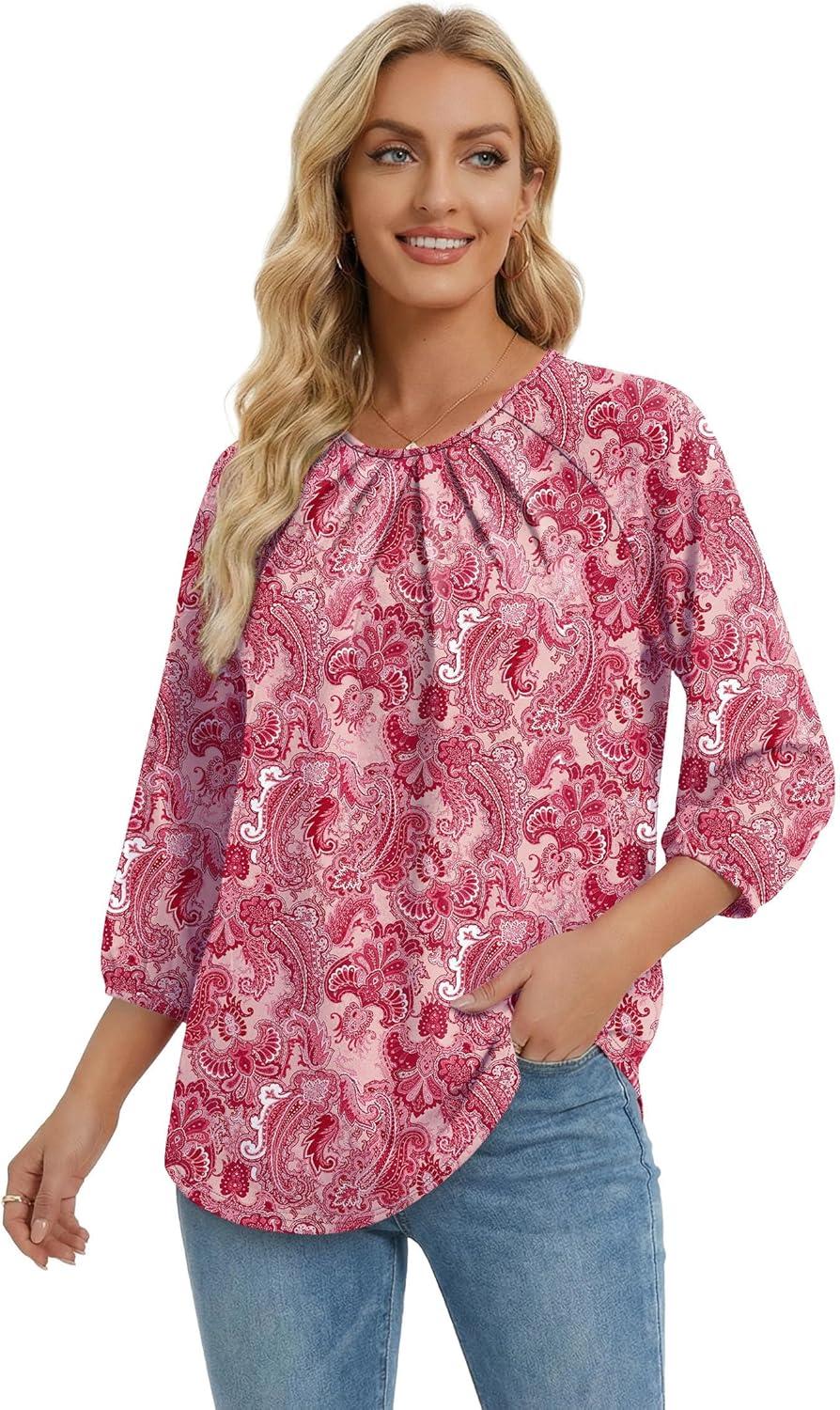 WIHOLL 3/4 Length Sleeve Womens Tops Pleated Front Crew Neck Blouses Dressy Casual Business Casual Spring Summer Shirts S-3XL(15 - Pink Paisley)