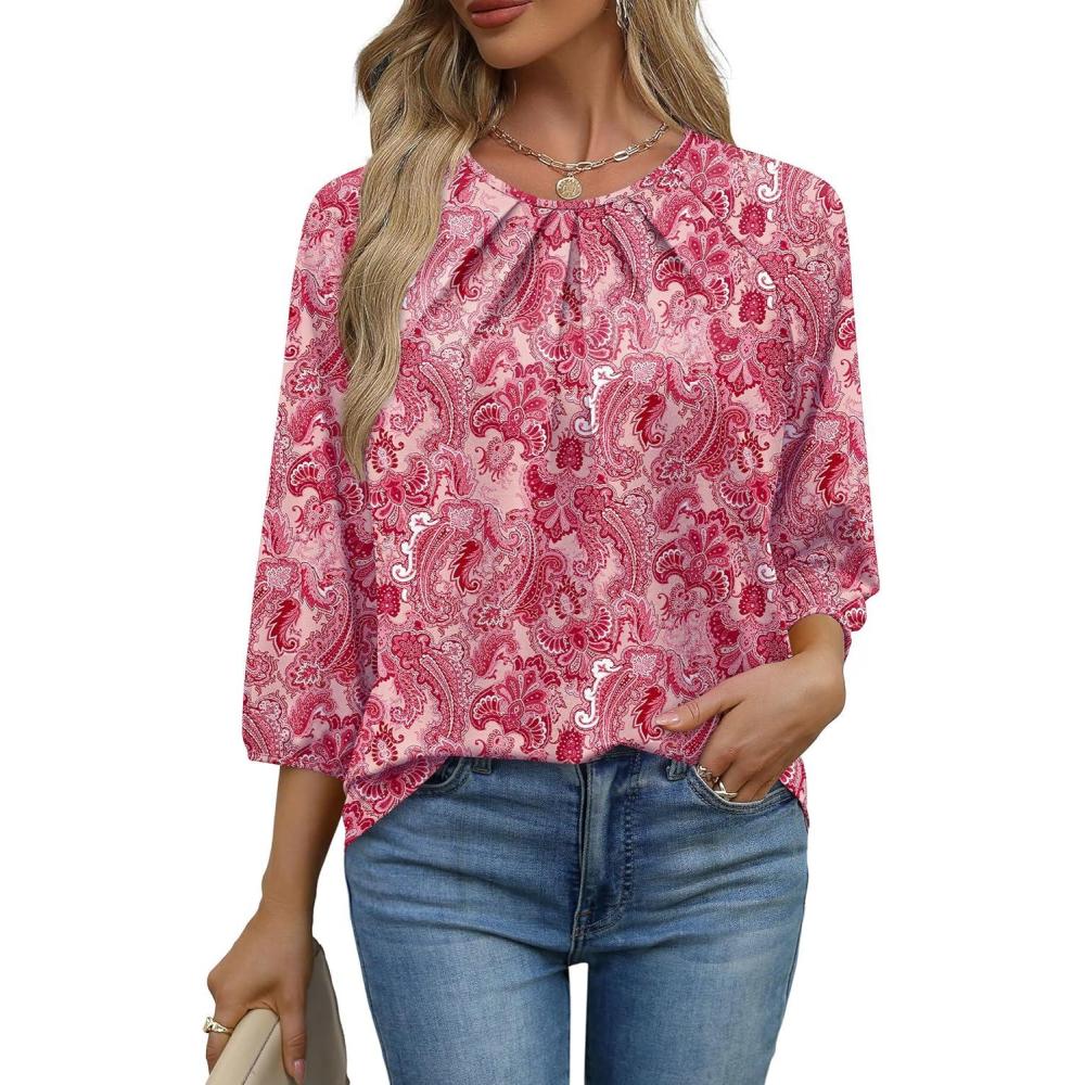 WIHOLL 3/4 Length Sleeve Womens Tops Pleated Front Crew Neck Blouses Dressy Casual Business Casual Spring Summer Shirts S-3XL(15 – Pink Paisley)