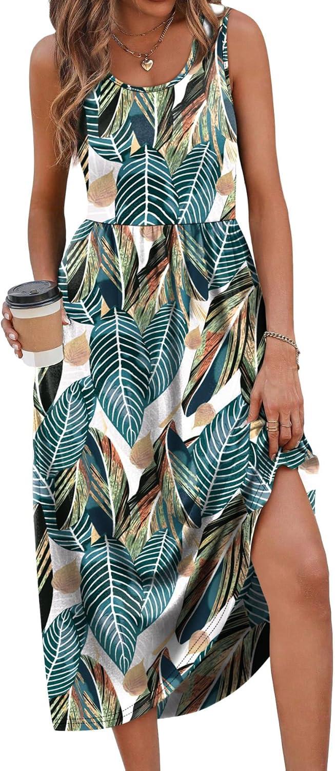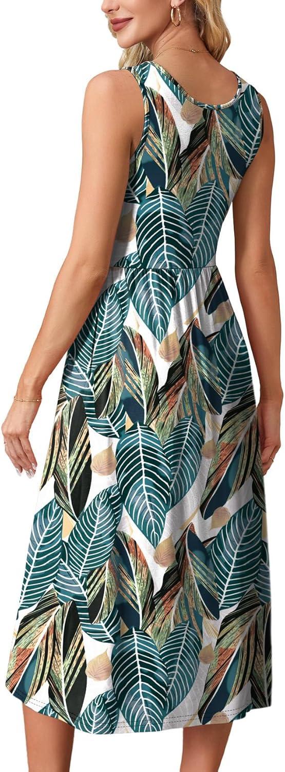 WIHOLL Summer Dresses for Women Flowy Casual Midi Dress Beach Vacation Sundresses with Pockets(Multicolor Tropical Leaves)