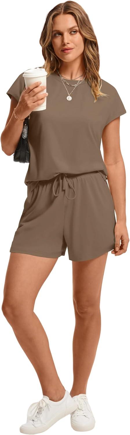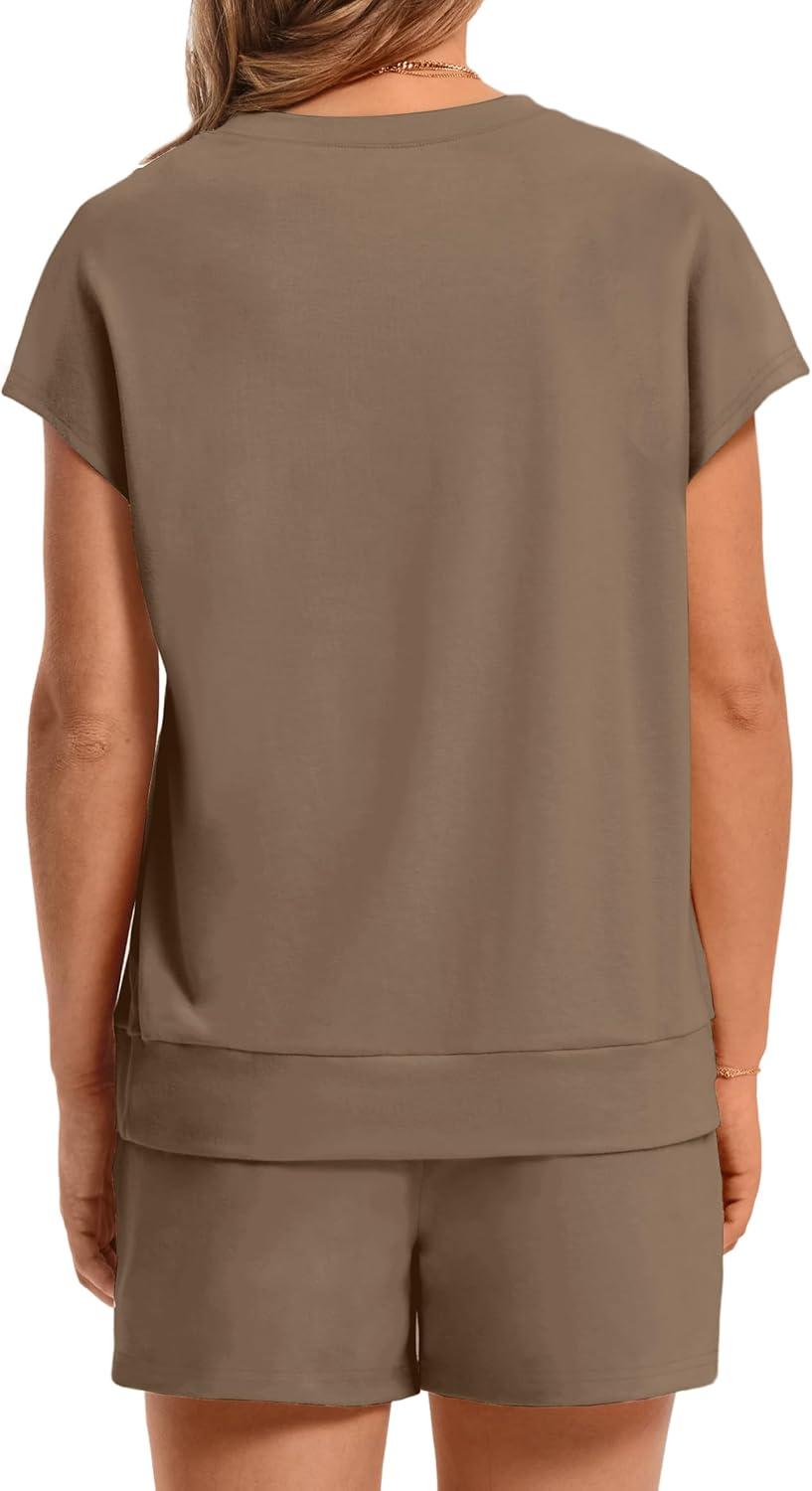 WIHOLL Two Piece Sets for Women Summer Crew Neck Lounge Short Sets Cap Sleeve Drawstring Sweatsuit with Pocket(2-coffee)