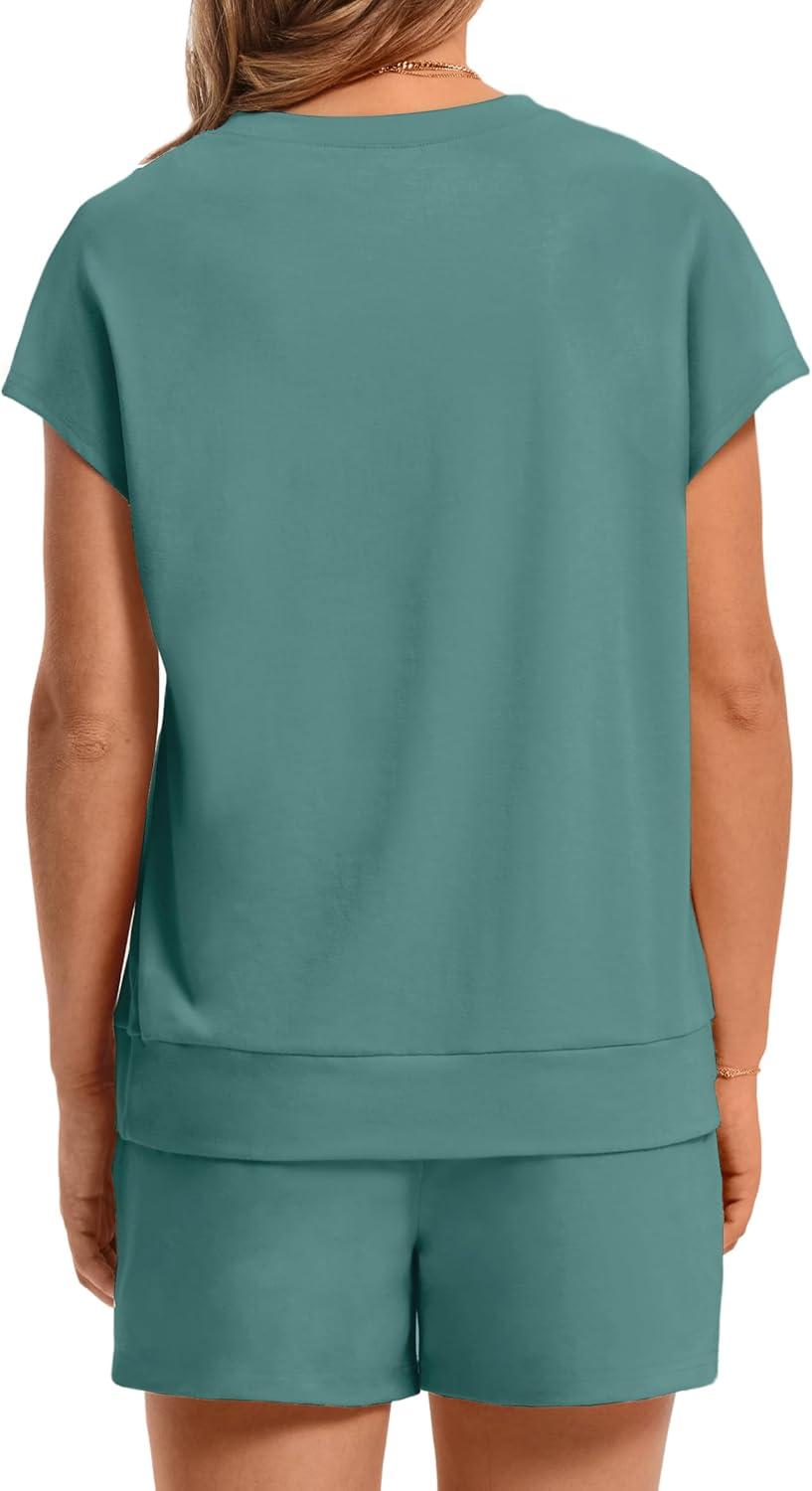 WIHOLL Two Piece Sets for Women Summer Crew Neck Lounge Short Sets Cap Sleeve Drawstring Sweatsuit with Pocket(2-grey Blue)
