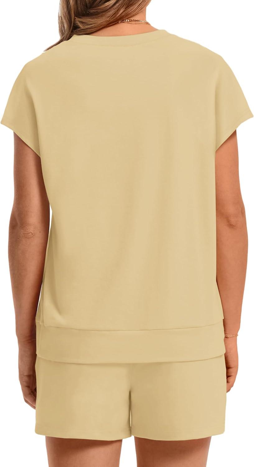 WIHOLL Two Piece Sets for Women Summer Crew Neck Lounge Short Sets Cap Sleeve Drawstring Sweatsuit with Pocket(3-yellow)
