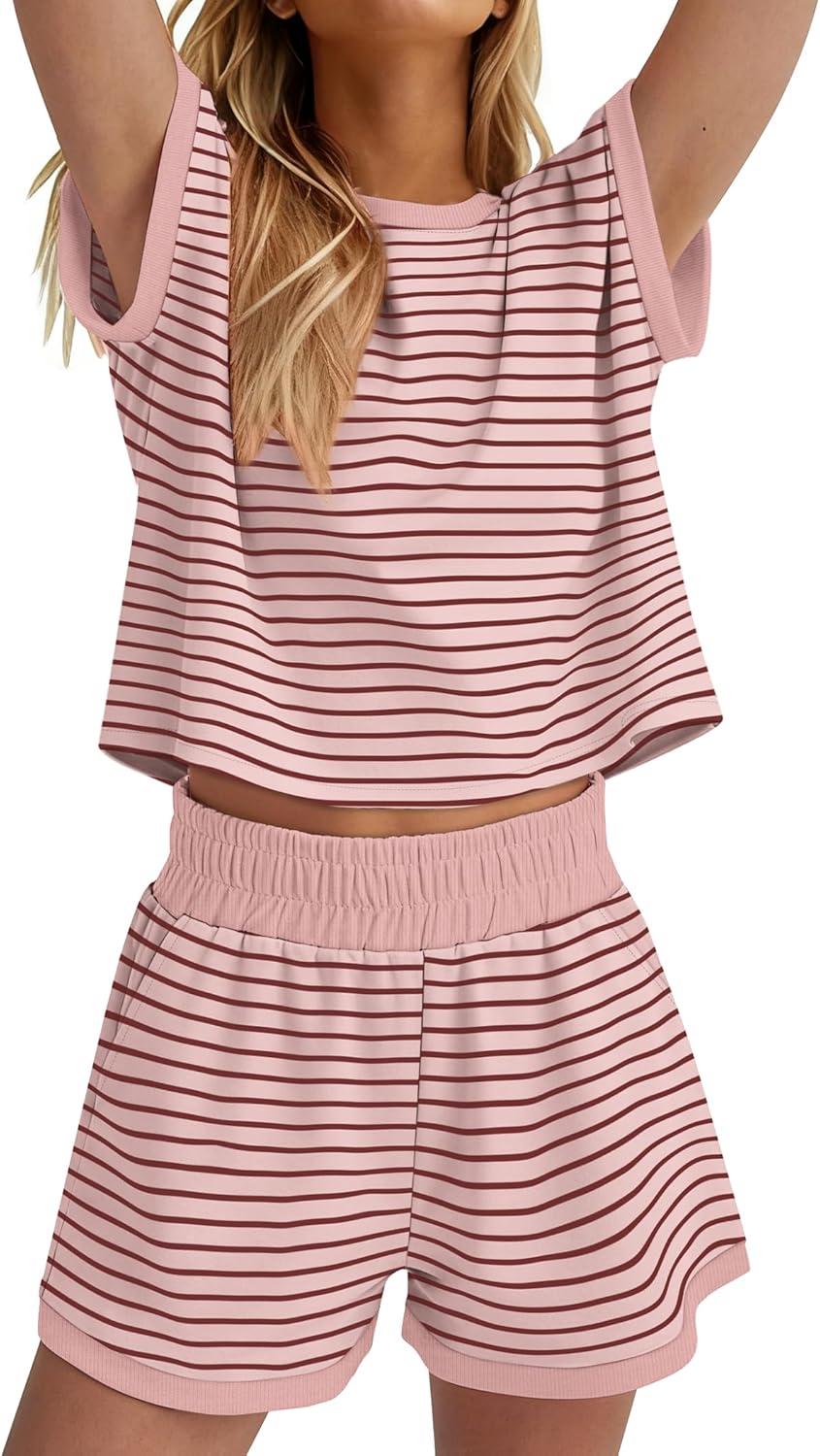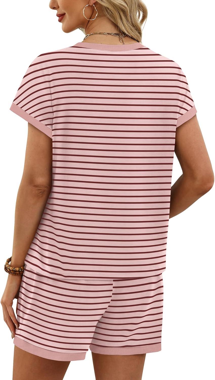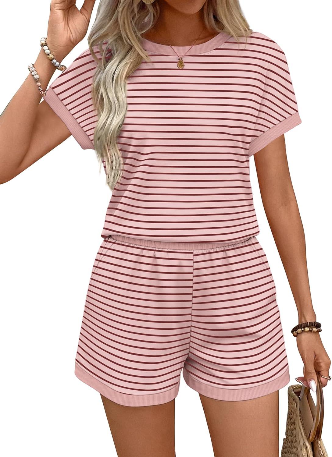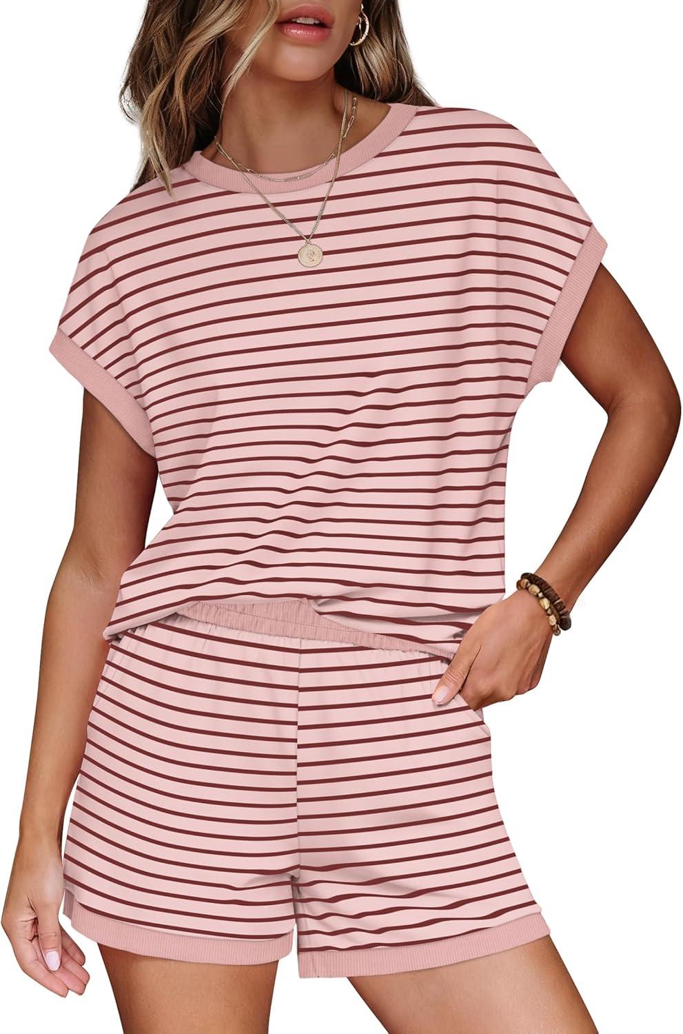 WIHOLL Two Piece Sets for Women Summer Lounge Short Sets Cap Sleeve Crew Neck Sweatsuit with Pocket XS-2XL(04-pink Stripe)