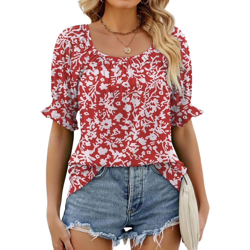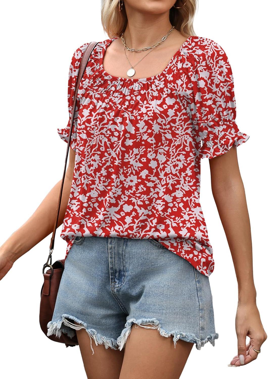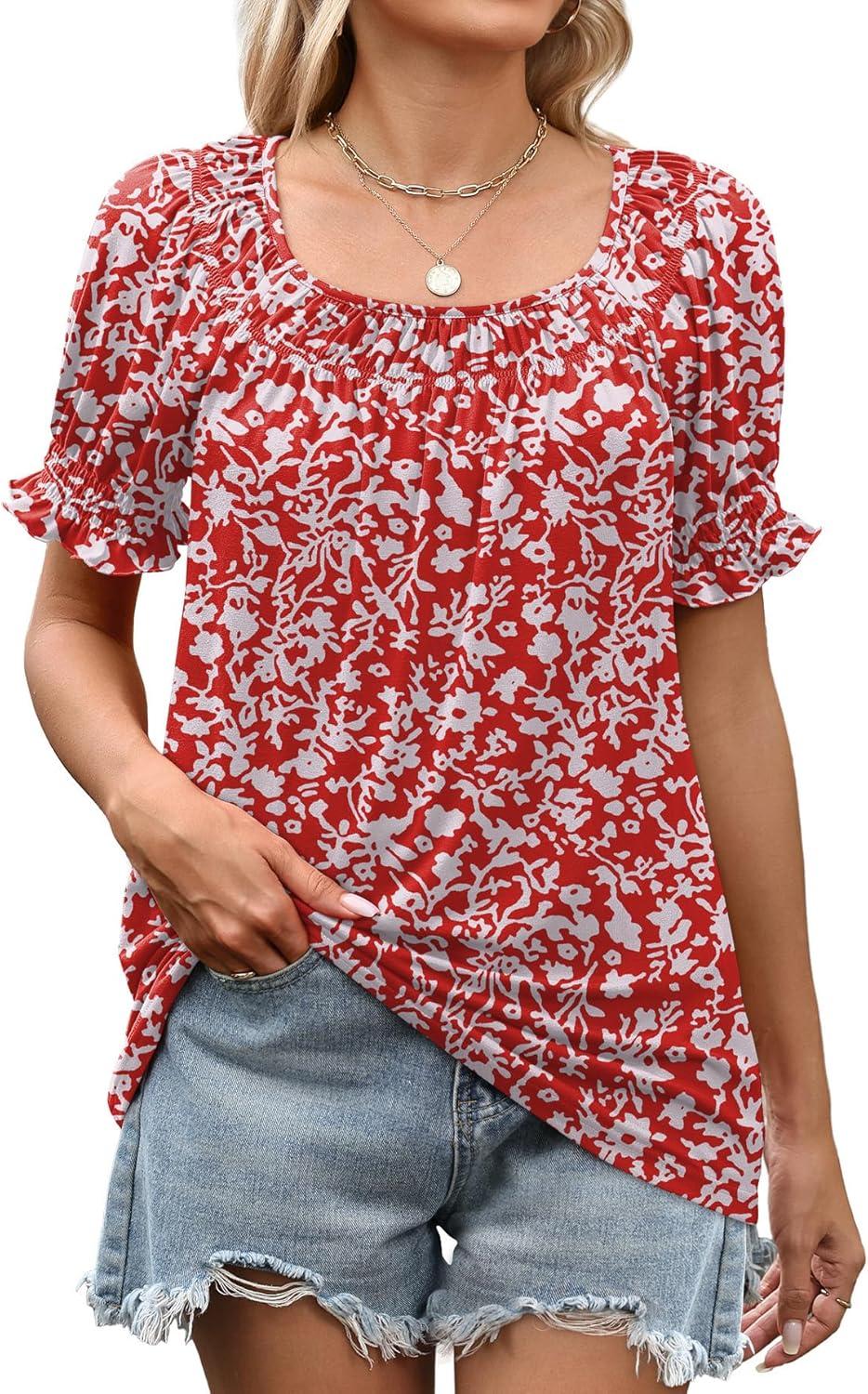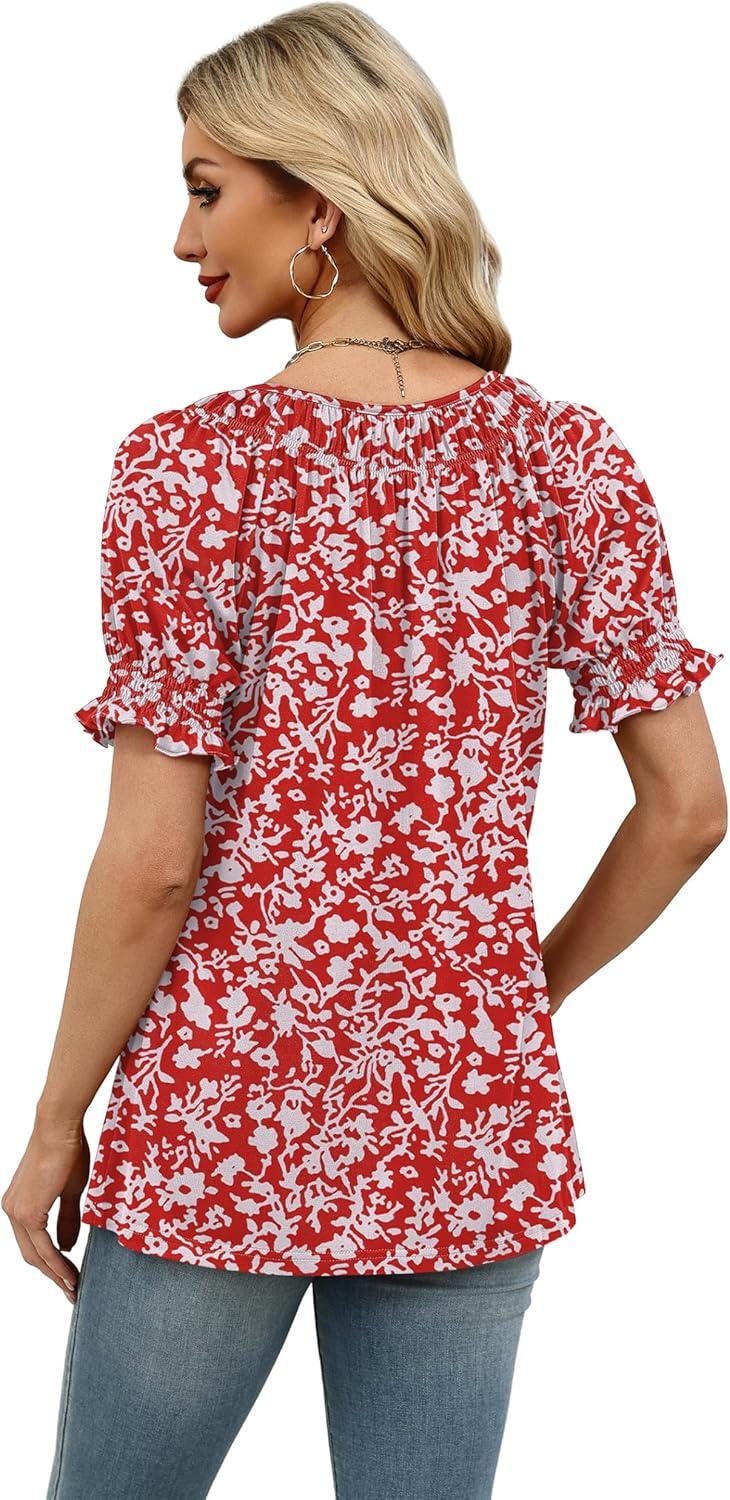 WIHOLL Womens Summer Tops Short Sleeve Shirts Smocked Puff Sleeve Blouses Casual Loose Fit Trendy Clothes (S-3XL)(B - Red White Floral)