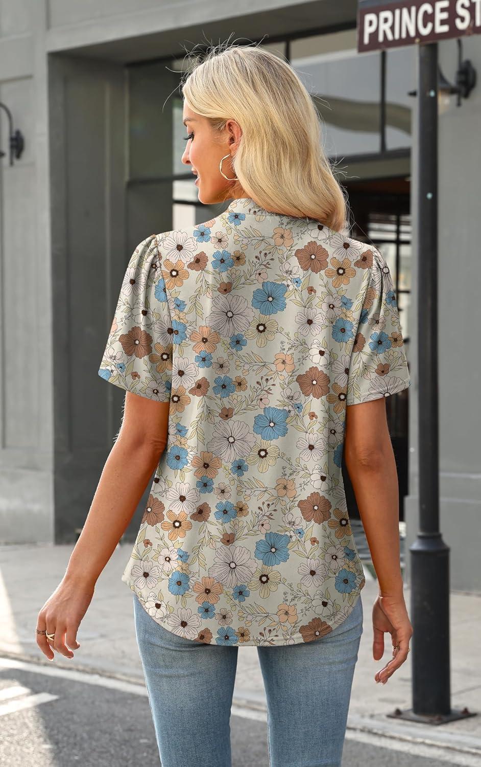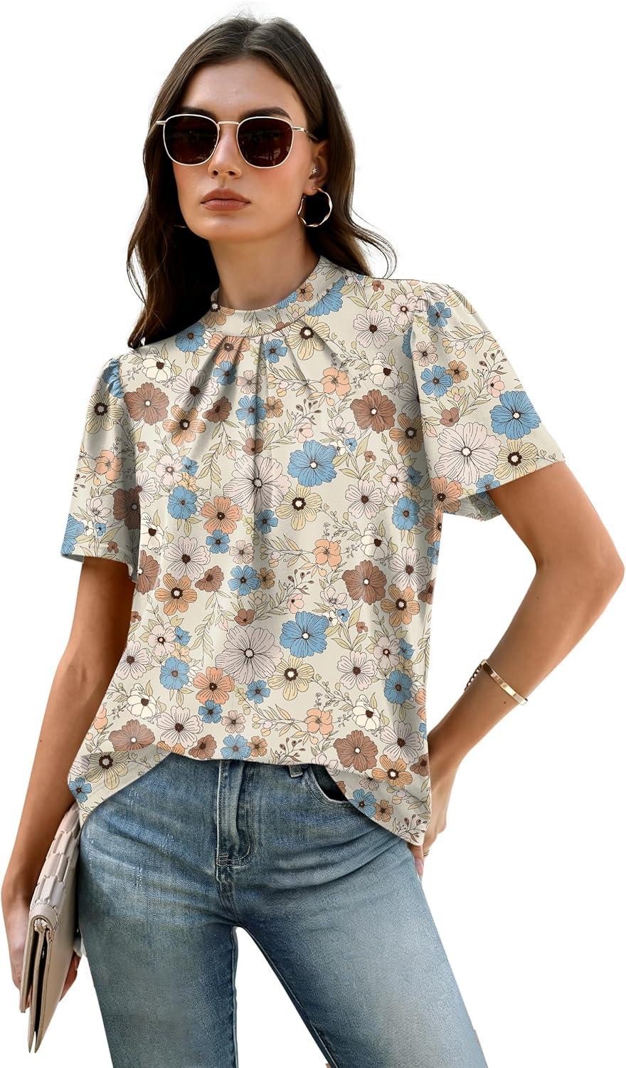 WIHOLL Womens Tops Short Puff Sleeve Shirts Mock Neck Pleated Spring Blouses Dressy Casual Business Casual Summer Outfits(02 – White Floral)
