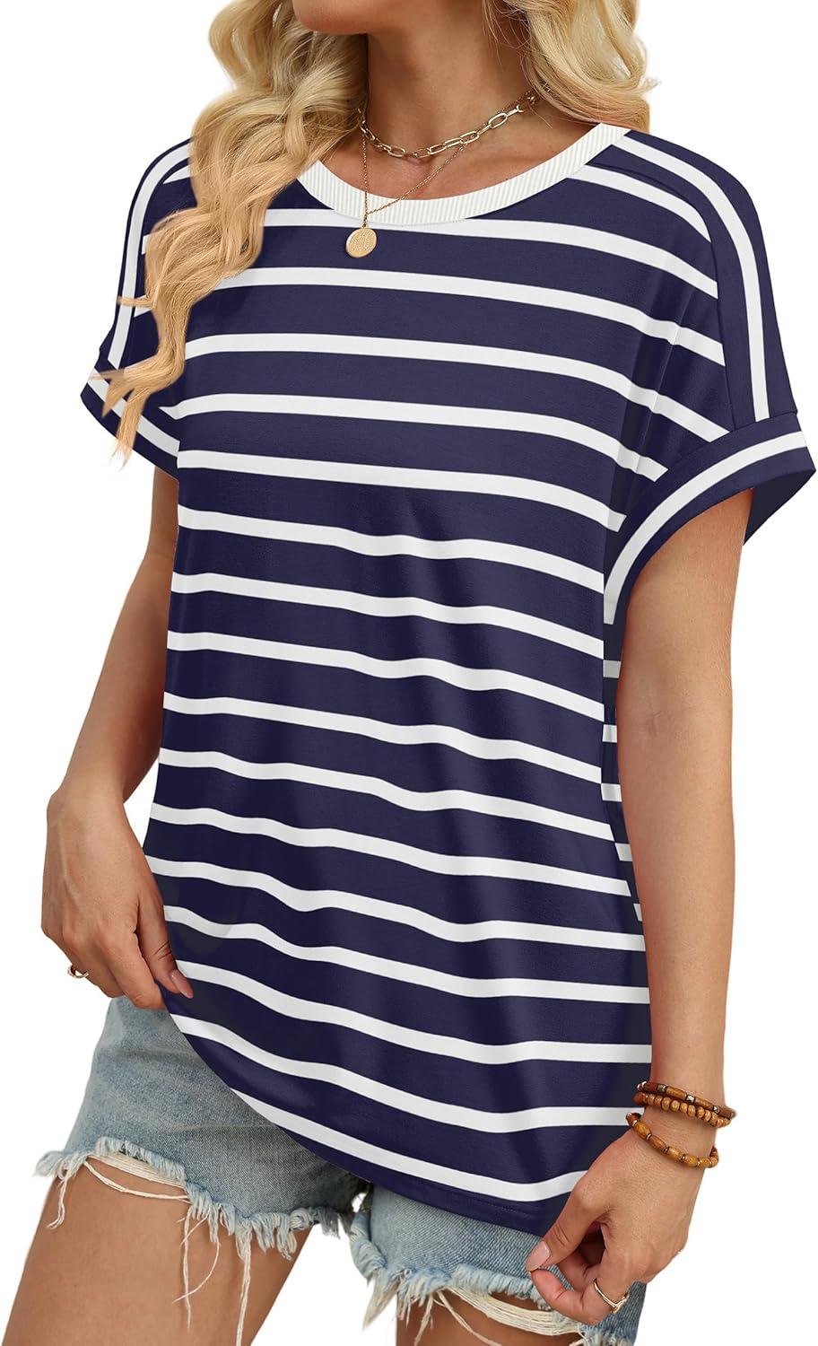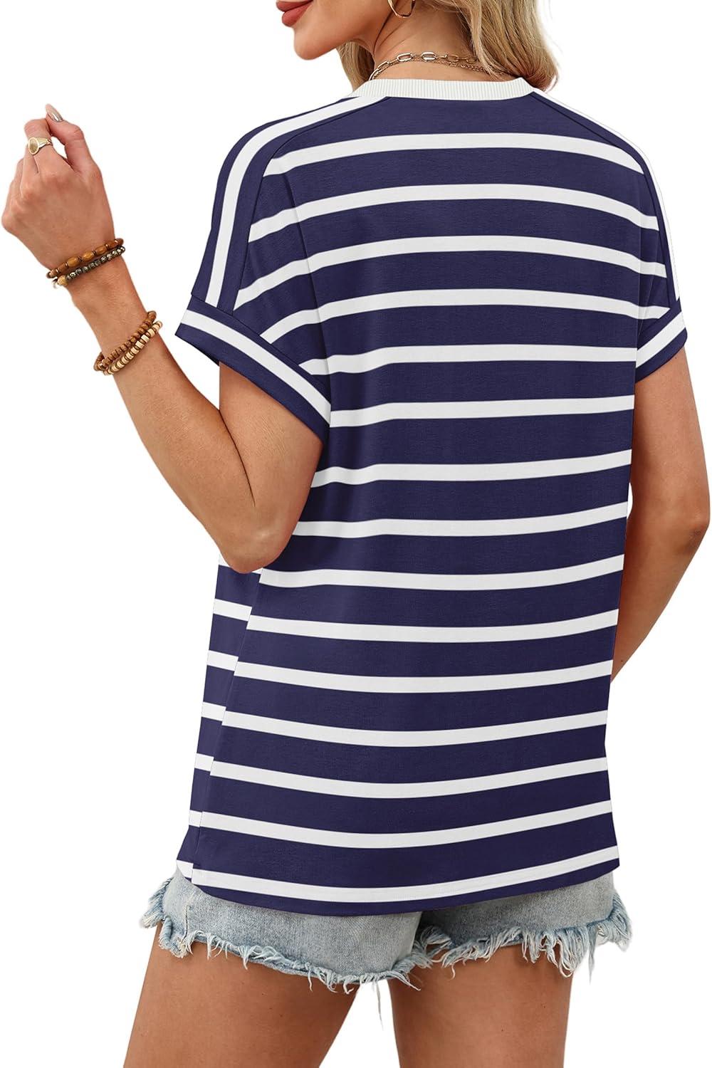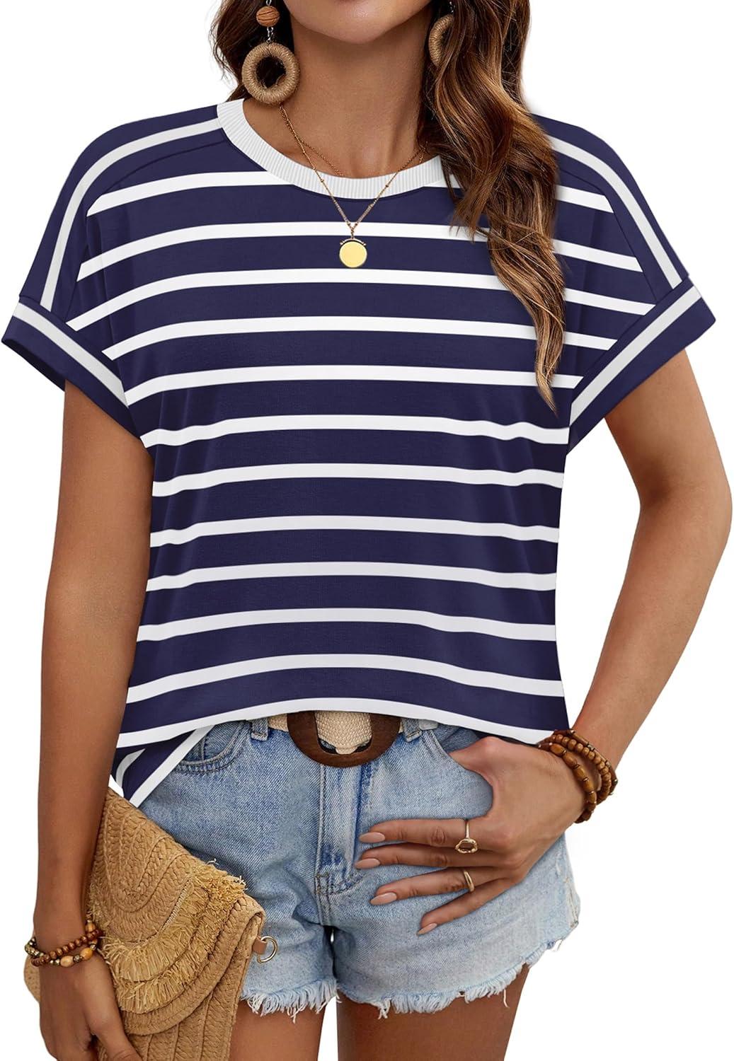 WIHOLL Womens Tops Short Sleeve Shirts Summer Outfits 2026 Spring Dressy Casual Clothes Clothing(Navy Stripes)