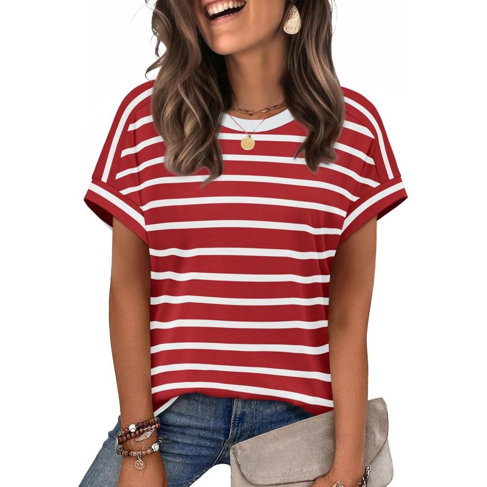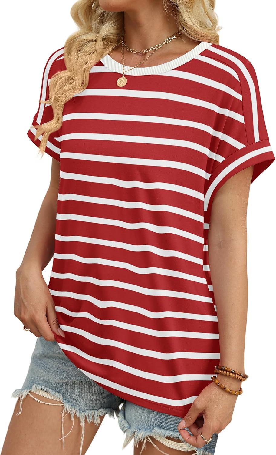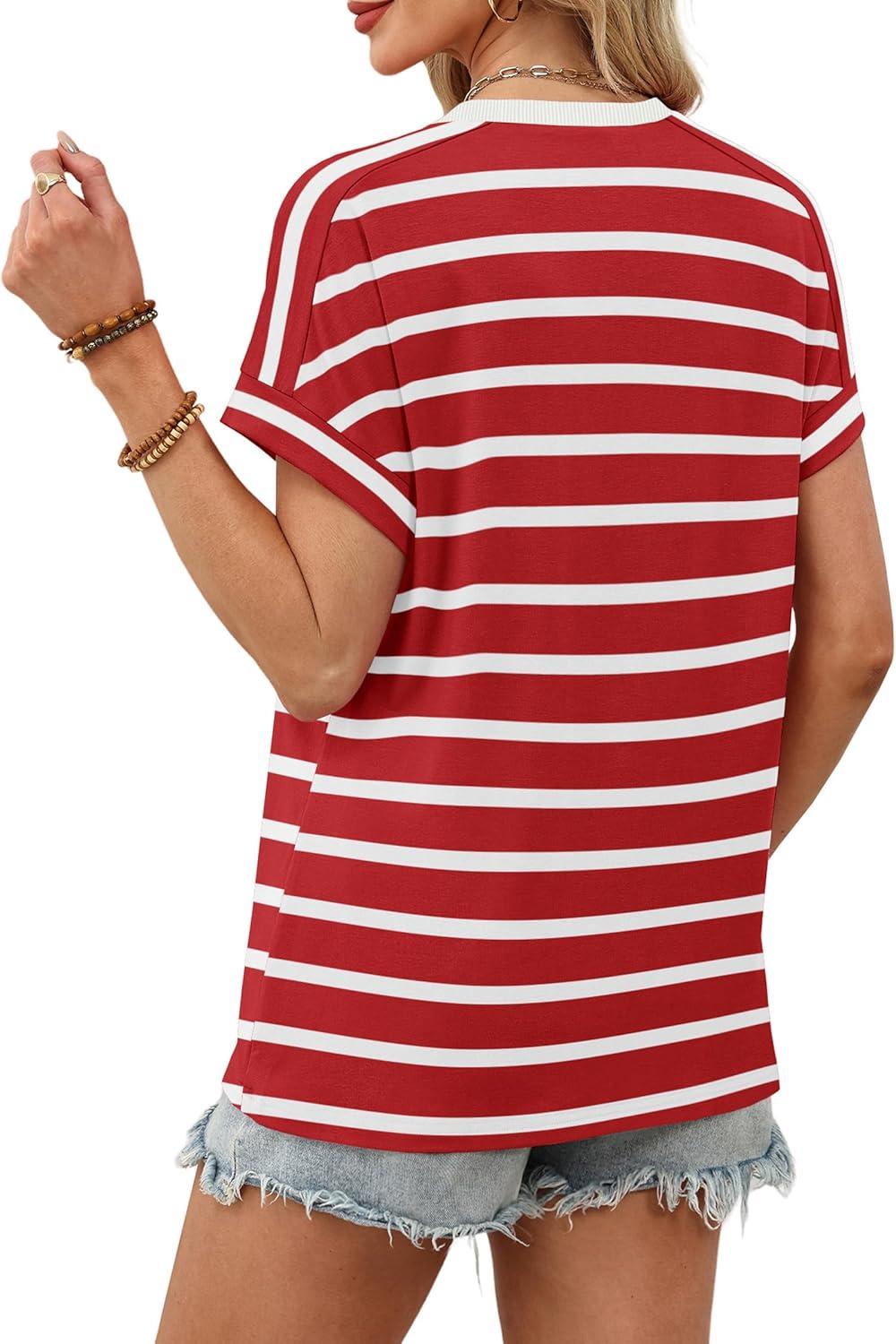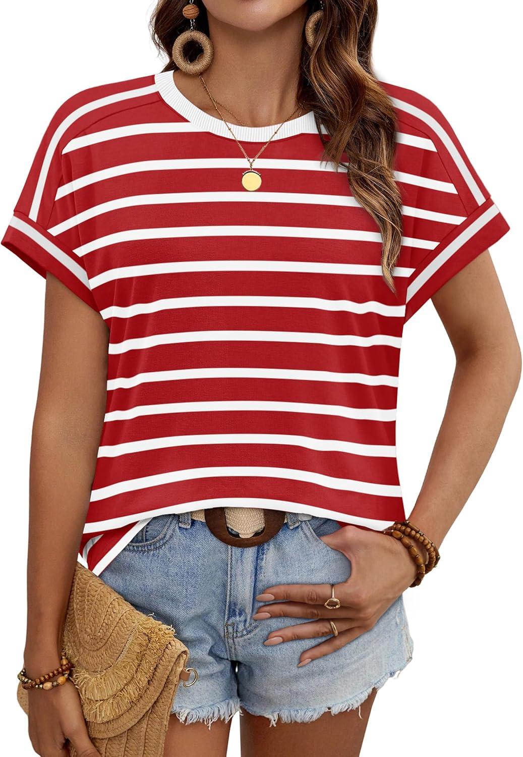 WIHOLL Womens Tops Short Sleeve Shirts Summer Outfits 2026 Spring Dressy Casual Clothes Clothing(Red Stripes)