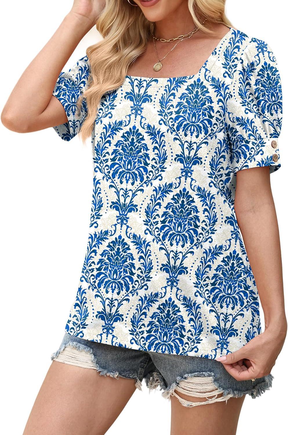 WIHOLL Womens Tops Summer Short Sleeve Shirts Square Neck Spring Outfits 2026 Fashion Clothing Blouses(Boho Blue)
