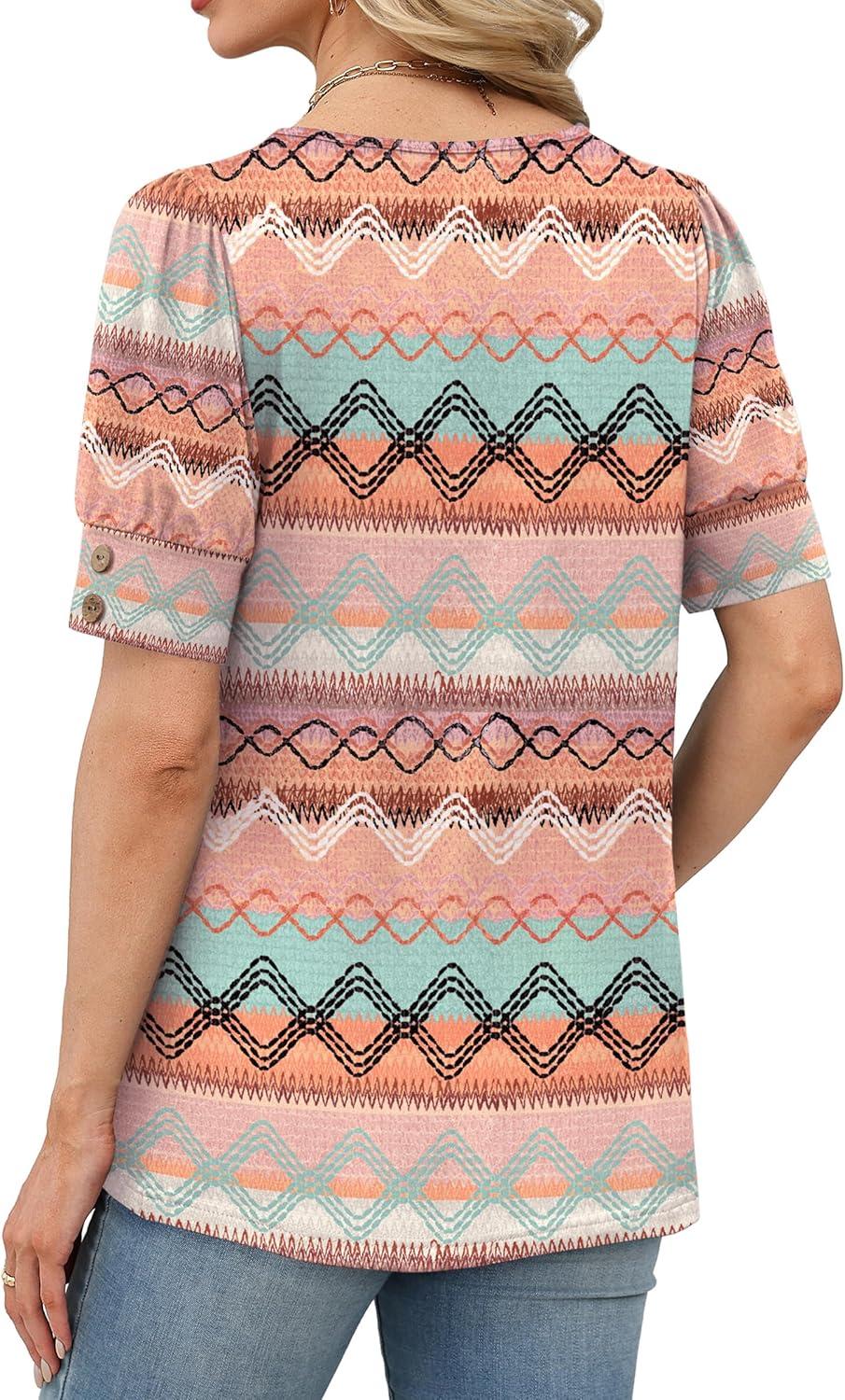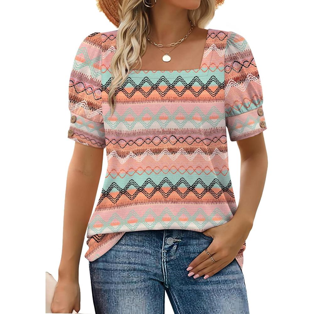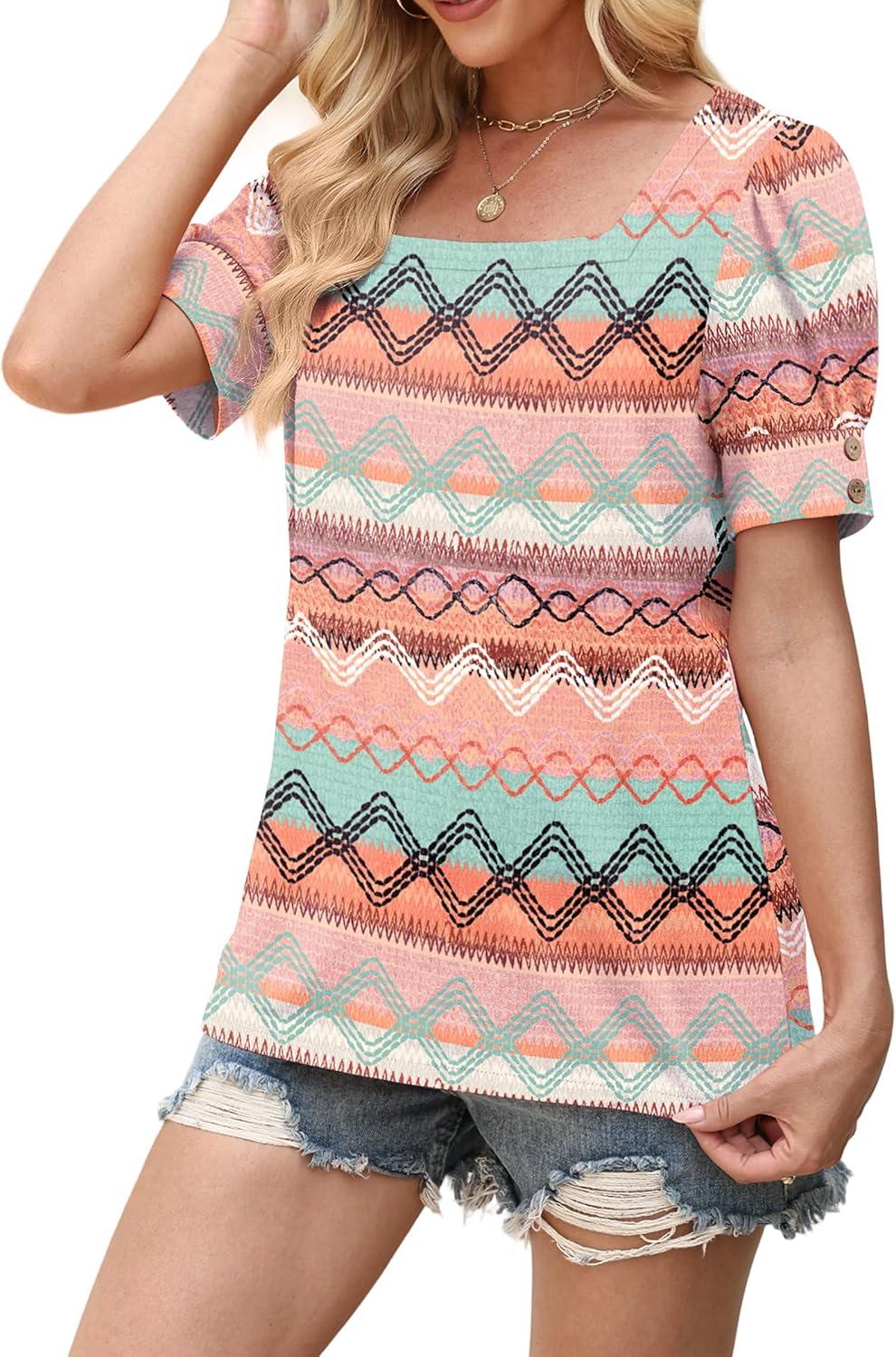 WIHOLL Womens Tops Summer Short Sleeve Shirts Square Neck Spring Outfits 2026 Fashion Clothing Blouses(Boho Stripes)